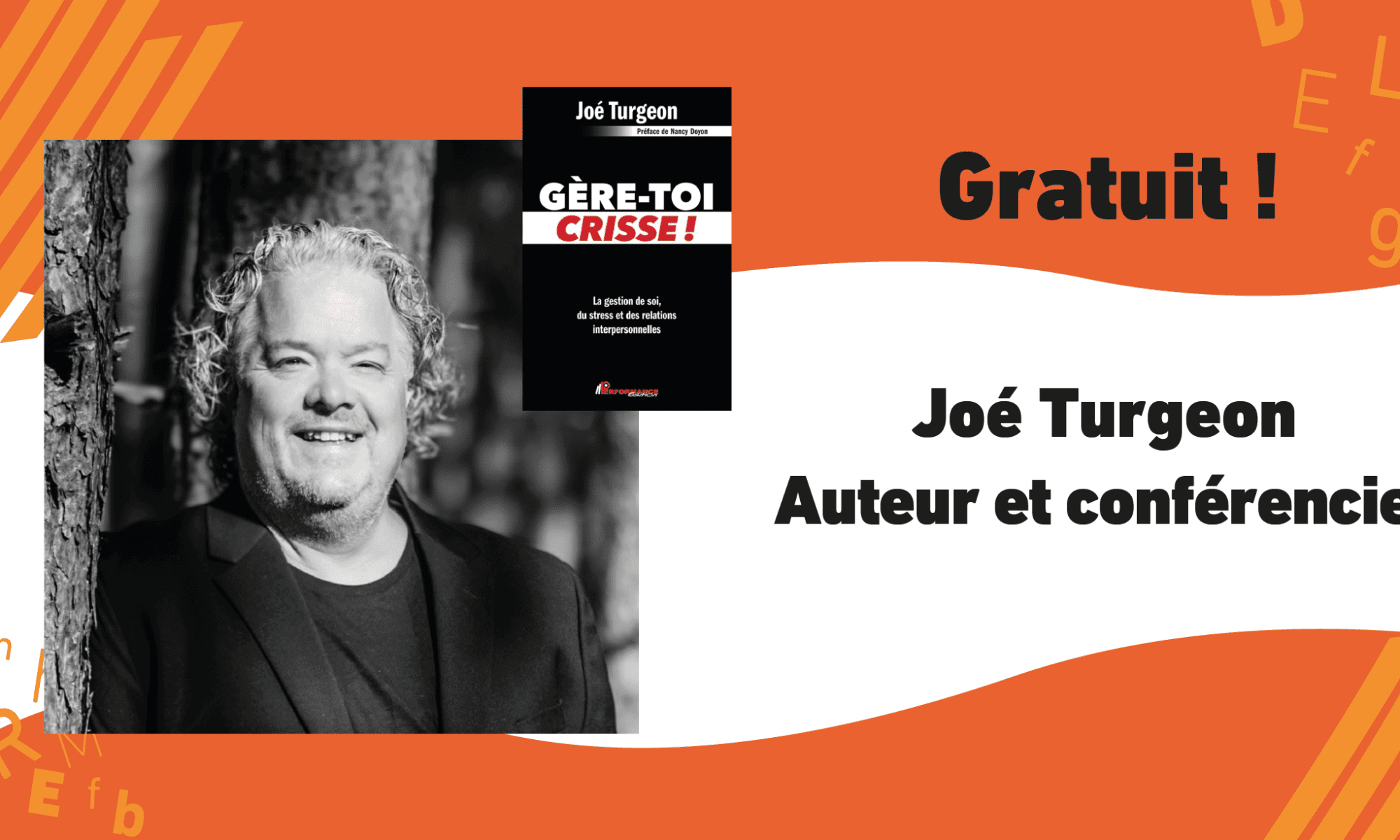 L’auteur du roman à succès « Gère-toi crisse ! » propose l’ANTI CONFÉRENCE : Parce que personne ne le fera à ta place ! ». Avec son franc-parler et son humour décapant, il invite les gens à découvrir l’importance de prendre en main son avenir et d’agir pour créer les opportunités que l’on souhaite.