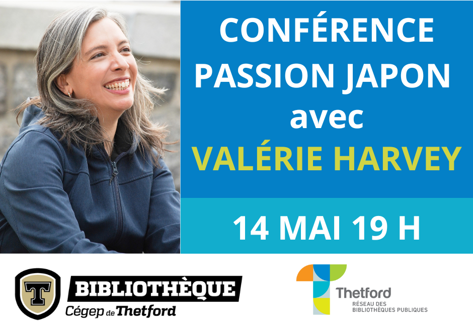 Le mercredi 14 mai, à 19 h, le Réseau des bibliothèques publiques de Thetford présente la conférence de Valérie Harvey, ayant pour titre, « Passion Japon ». Celle-ci aura lieu au Cégep de Thetford.