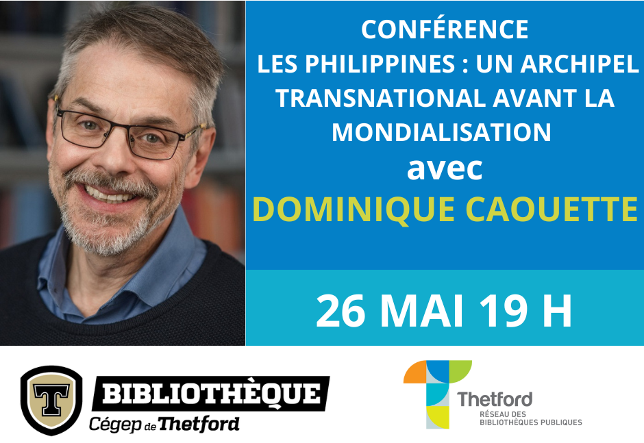 Le lundi 26 mai, à 19 h, le Réseau des bibliothèques publiques de Thetford présente la conférence de Dominique Caouette, ayant pour titre, « Les Philippines : un archipel du Sud-Est asiatique transnational avant même la mondialisation ». Celle-ci aura lieu au Cégep de Thetford.