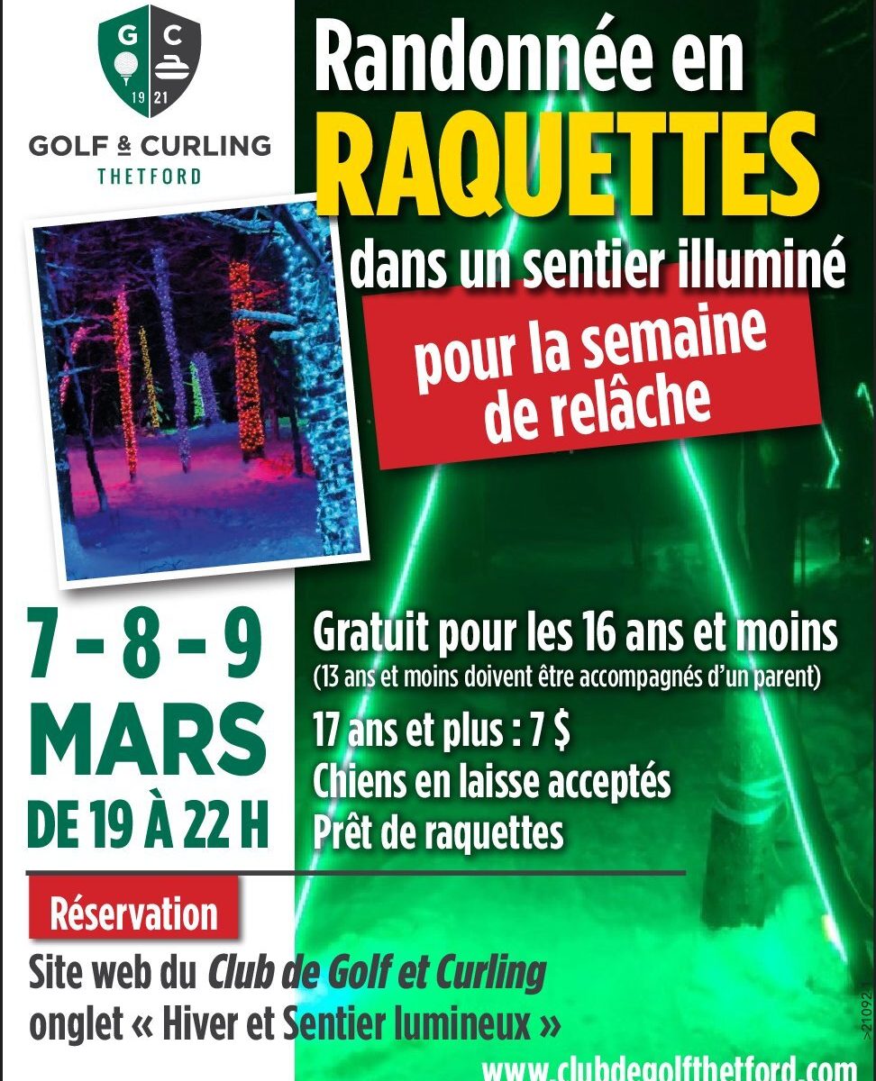 Une randonnée en raquettes dans un sentier illuminé, à mettre à votre horaire durant la semaine de relâche: 7-8-9 mars de 17h00 à 22h00 au Club de golf et curling de Thetford Mines.