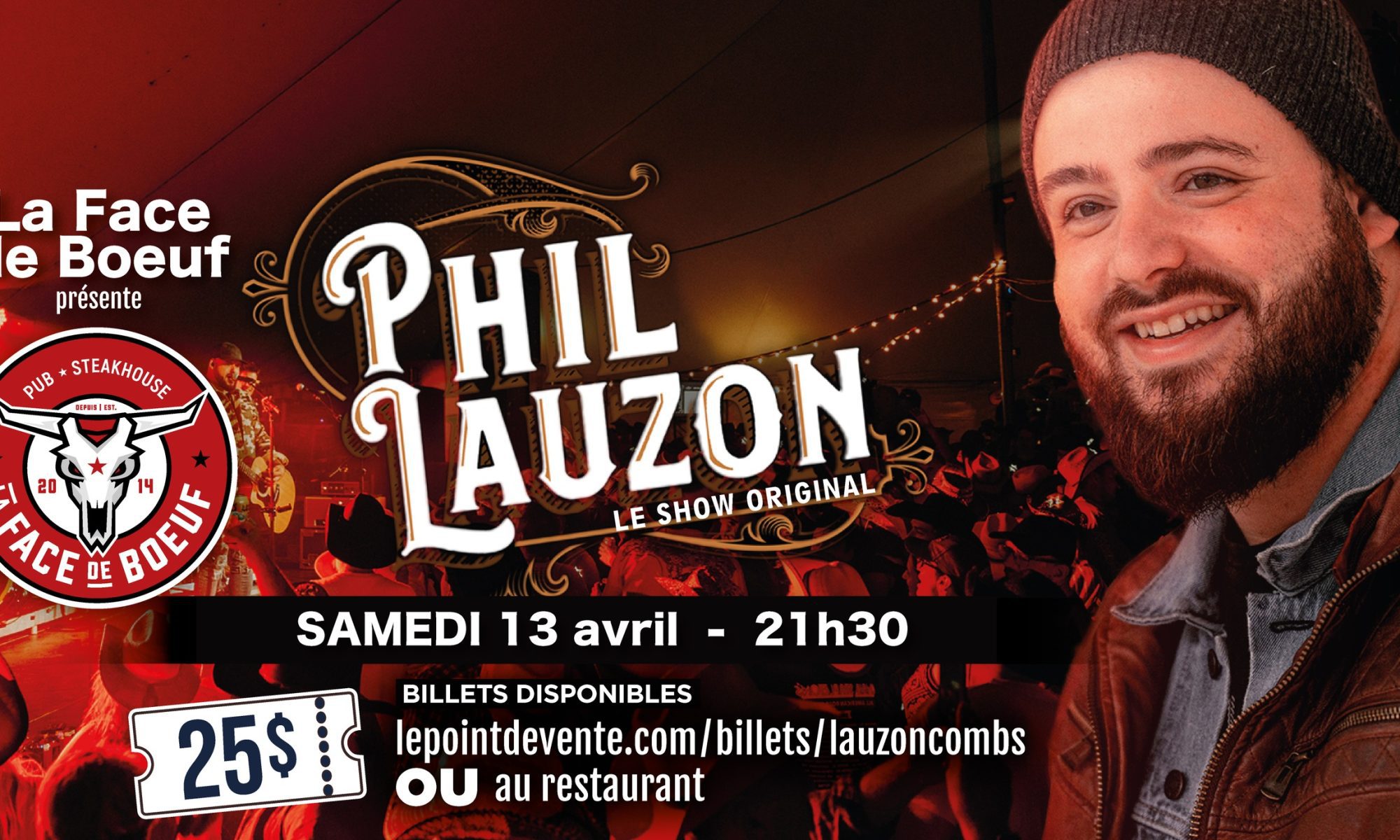 SAMEDI le 13 AVRIL 2024 vers 21h45, Phil Lauzon revient en ville pour nous présenter son spectacle original!
