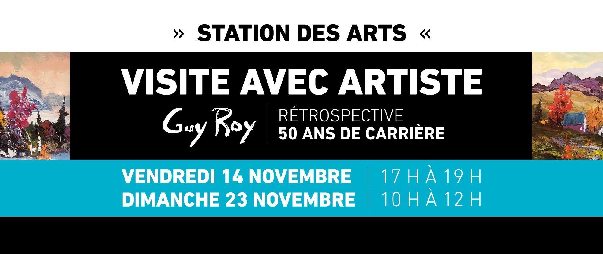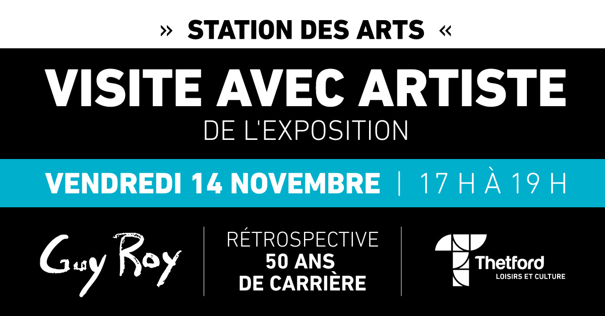 Dans le cadre de l’exposition, Guy R oy-Rétrospective 50 ans de carrière présentée à la Station des arts jusqu’au 23 novembre prochain, la Ville de Thetford Mines invite la population à participer à deux visites privilégiées avec l’artiste, les 14 et 23 novembre prochains. Parmi les plus marquantes de l’histoire de la Station des arts, cette rétrospective attire un nombre exceptionnel de visiteurs, captivés par le parcours remarquable du peintre et de sa carrière artistique.