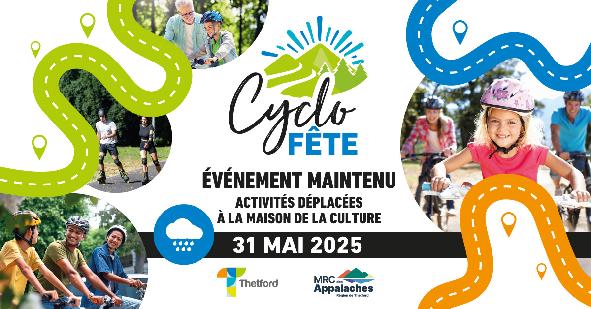 La Ville de Thetford Mines, en collaboration avec la MRC des Appalaches, est fière d’inviter la population à participer à la toute première édition de la Cyclo-Fête qui se tiendra le samedi 31 mai prochain de 10 h à 16 h. Organisé dans le cadre du Mois du vélo, cet événement festif promet une journée haute en couleur sur la piste cyclable avec une foule d’activités gratuites et accessibles à tous.